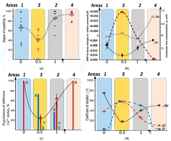 Taking into account the parametrical dependence, we consider the spatial changes in the sequence intact area 1 → vicinities of the sclerosis area 2 → sclerosis area 3 in Figure 4a–c as the corresponding temporal changes in D(τ), Δc(τ), Δa(τ), ω(τ), and PA(τ) as increases from 0 to 1. Looking at the graphs, we see that the most dramatic destruction of the atomic-molecular architecture of mineralized bone occurs upon its contact with the damaged collagen fibers. After their complete removal in area 2, bone regeneration becomes the prevailing trend. Thus, we can assume that the opposition of catalytic processes caused by OA and cellular effects determines the atomic-molecular architecture in 3, and the resumption of the biomineralization process controls it in 2.