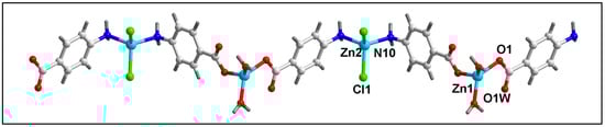 Figure 1 represents the molecular structure of compound 1. Table 2 contains the bond lengths and the bond angles around the central Zn(II) metal centers. Compound 1 crystallizes in the monoclinic P2/c space group. The polymeric chain of compound 1 contains two different Zn(II) centers (Zn1 and Zn2) with different coordination environments. The Zn1 center is tetra-coordinated with two coordinated water (O1W and O1W’) and two O-atoms (O1 and O1’) of the two bridging 4-AmBz ligands. Similarly, the Zn2 center is also tetra-coordinated with two Cl and two N-atoms (N10 and N10’) of –NH2 groups of the two bridging 4-AmBz moieties. Both Zn1 and Zn2 centers have nearly tetrahedral geometries with the corresponding bond angles ranging from 90.2 to 108.2°. The average metal-ligand bond lengths are comparable to the previously reported Zn(II) compounds [66]. The Zn1–Zn1, Zn1–Zn2, and Zn2–Zn2 distances in the molecular structure of compound 1 are found to be 16.323, 9.139, and 16.323 Å, respectively.