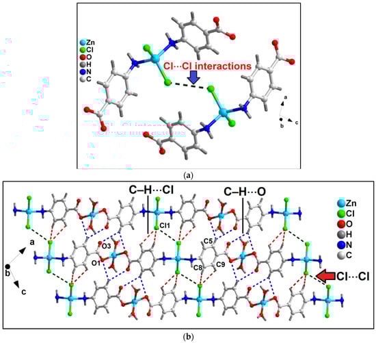 In the crystallographic ac plane, the neighboring 1D chains of compound 1 are interconnected through C–H⋯O and C–H⋯Cl hydrogen bonding and Type I Cl⋯Cl interactions to form the layered assembly [67] (Figure 2b). C–H⋯O hydrogen bonding interactions are observed involving the–CH moiety (–C5H5) of 4-AmBz and the coordinated O1 and uncoordinated O3 atoms of the bridging 4-AmBz having C5–H5⋯O1 and C5–H5⋯O3 distances of 2.73 and 2.84 Å, respectively. Cl1 ion and –CH moieties are involved in C–H⋯Cl interactions with the C8–H8⋯Cl1 and C9–H9⋯Cl1 distances of 3.05 and 3.02 Å, respectively.