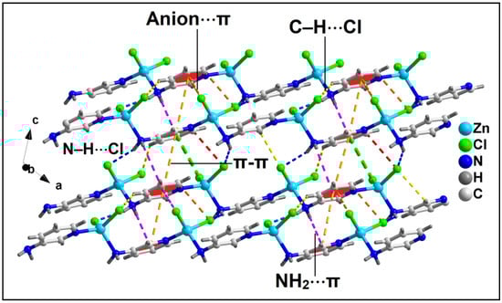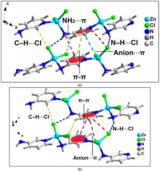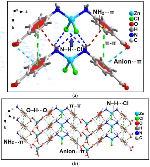 Studies on non-covalent interactions such as hydrogen bonding, electrostatic and charge-transfer interactions, π-stacking and metal ion coordination, etc. have attracted researchers from the crystal engineering viewpoint [9,10,11]. Hydrogen bonding—one of the commonly observed non-covalent interactions—can effectively control the secondary coordination sphere of metal ions [12,13]. Supramolecular non-covalent contacts involving the aromatic π-systems have also played important roles in the stability of the crystal structures [14]. It has been well established that metal-coordinated organic moieties with aromatic rings can be either electron-rich (donor) or electron-deficient (acceptor) to direct molecular self-assemblies with diverse structural topologies [15,16]. However, dual non-covalent donor-acceptor topologies of aromatic rings of metal-coordinated organic ligands are still only scarcely explored in the literature. Cl⋯Cl interaction has also emerged as a potential non-covalent interaction which can also be termed a donor-acceptor interaction [17]. Moreover, unusual NH2⋯π type non-covalent interactions have also gained interest from researchers in the field of supramolecular chemistry [18]. Experimental analysis aided by computational studies is important to visualize such unusual non-covalent interactions which can be used for engineering crystal structures with desired physical and chemical properties.