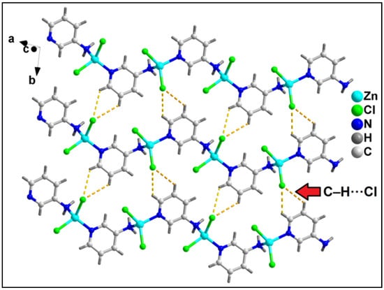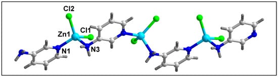 The molecular structure of compound 2 has been depicted in Figure 4. Table 2 contains the bond lengths and bond angles around the central Zn(II) center. Compound 2 crystallizes in the monoclinic Cc space group. Compound 2 contains one Zn(II) center, two bridging 3-AmPy ligands, and two Cl atoms. The Zn(II) center in polymer 2 has a nearly tetrahedral coordination geometry which is formed by two Cl atoms and two N atoms of 3-AmPy, having bond angles in the range of 102.01 to 119.8°. Zn–Cl bond lengths are in the range from 2.231 to 2.236 Å; whereas the Zn–N bond lengths are in the range of 2.025 to 2.086 Å (see Table 2) [70,71]. The adjacent Zn(II) centers of compound 2 are separated by a distance of 6.181 Å.