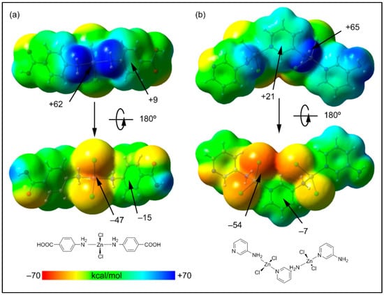 As commented above, among the myriad of non-covalent interactions, the aromatic rings participate in both anion-π (involving either the chlorido or carboxylato ligands) and NH2···π interactions involving the coordinated amino groups. Both interactions are opposite in nature since in the former, the aromatic ring is accepting charge and in the latter is donating charge. Therefore, the aromatic ring is acting as both an electron donor and acceptor simultaneously. To shed light on this unexpected behavior, we have first computed the molecular electrostatic potential surfaces of simplified models of polymers 1 and 2 (Figure 8). The molecular electrostatic potential maximum is located at the H-atoms of the amino groups (+62 kcal/mol in 1 and +65 kcal/mol in 2). These significant molecular electrostatic potential values are due to the enhanced acidity of the –NH2 protons due to the coordination of the amino group to the Zn2+ ion. The molecular electrostatic potential minimum is located at the chlorido ligands, as expected (−47 kcal/mol in 1 and −54 kcal/mol in 2). These results agree with the abundance of N–H···Cl interactions in the solid state of both compounds. In addition, more interesting are the MEP values over the center of the coordinated 4-AmBz and 3-AmPy ligands (Figure 8). The values are positive on one side (+9 and +21 kcal/mol in 1 and 2, respectively), and negative over the opposite side (−15 and −7 kcal/mol in 1 and 2, respectively), thus revealing the duality of these coordinated ligands and explaining the simultaneous formation of NH2···π and anion–π interactions.