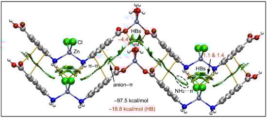 We have used the (QTAIM) and (NCI plot) index analyses in an extended dimeric model of the layered structure commented above (Figure 3b), that is stabilized by H-bonds, π–stacking, anion–π, and NH2···π interactions. The NCI plot index is an intuitive visualization index that facilitates the representation of non-covalent interactions in real space, showing which molecular regions interconnect.