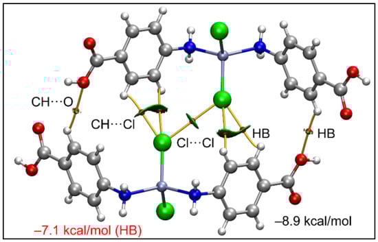 Interestingly, there is also a network of H-bonds that is energetically significant with a total H-bond interaction energy of −18.8 kcal/mol calculated using Vr values at the bond CPs. It can be observed that the chlorido ligands interact with the NH2 groups establishing four H-bonds, each one characterized by a bond CP and bond path interconnecting the Cl and H-atoms. Similarly, the coordinated water molecules of the other Zn(II) ion also establish two H-bonds (as donors) with the coordinated carboxylato groups. The formation energy of this dimeric assembly is very large (−97.5 kcal/mol) due to this intricate combination of interactions and evidencing the importance of these contacts in the crystal packing of 1. Using a minimalistic model of compound 1, we have also studied the Cl···Cl contact commented above (Figure 2).