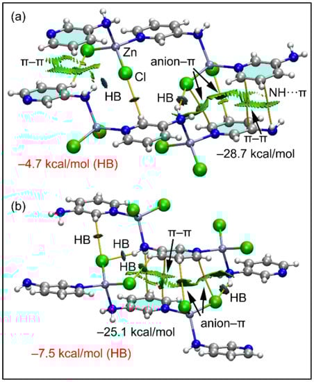 In compound 2, using the model depicted in the lower part of Figure 5b, we have analyzed two dimers retrieved from its solid state. In both dimers, the aromatic ring establishes both anion-π and NH2···π interactions, similar to compound 1. Both dimers are represented in Figure 11 exhibiting similar dimerization energies. The π-interactions (π–π, NH2···π and anion–π) are characterized by the corresponding bond CPs and bond paths interconnecting the atoms of the counterparts. All three interactions are also revealed by the NCI plot analysis and characterized by green RDG isosurfaces, confirming their attractive nature. The analysis also shows the presence of C–H···Cl and N–H···Cl H-bonding interactions that contribute −4.7 and −7.5 kcal/mol for the dimers in Figure 11a,b, respectively, thus evidencing that the π-interactions dominate the formation of the dimers. These results evidence that π-interactions are more relevant than the H-bonds in the crystal packing of compound 2.