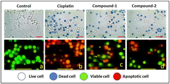 Upper panel shows the results of trypan blue assay of the compound’s DL cells. Lower panel represents the morphological feature of living (green) and apoptotic (red) DL cancer cells observed under fluorescence microscope. Figure corresponds to apoptosis (450×) induced by the compounds at highest potent dose (10 μM).