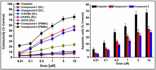 Concentration-dependent cytotoxicity (left) induced by compounds 1 and 2 in DL cells. The results of the compounds were compared with cisplatin (reference drug). Percentage apoptotic cells (right) in DL cell line after exposure to compounds 1 and 2. Data are mean ± S.D., n = 3.