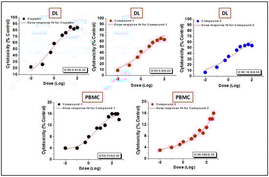 The preclinical assessment of newly synthesized drugs/compounds can be typically evaluated by the half maximum inhibitory concentration (IC50) which can be measured by the substance’s ability to inhibit 50% of biological processes [100]. The dose-response curves and the IC50 values of the compounds have been represented in Figure 14 and Table S2, respectively. Compound 1 exhibits a lower IC50 value (5.8 μM) than that of compound 2 (16.8 μM) in DL cells after 24 h of treatment (Figure 14). The IC50 value of cisplatin (reference drug) ranges from 0.5–0.6 μM under the same experimental conditions. Several research groups have reported the significant anticancer activities of transition metal compounds against DL cells [38,39,40]. However, they have not investigated the cytotoxicity of the compounds in normal cell lines. In our study, the promising outcome of the results of the cytotoxicity assay is that the compounds induced significant concentration-dependent cytotoxicity in DL cancer cells with negligible cytotoxicity in PBMC cells. Moreover, most of the previous reports do not perform the molecular docking simulation (vide infra) to establish the probable mechanism of the synthesized compounds in the cytotoxic assay.