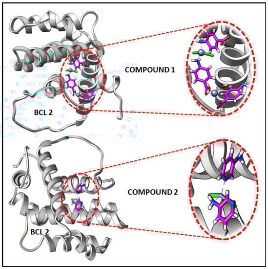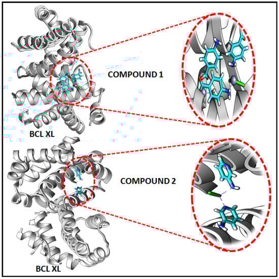 Molecular docking is a theoretical approach that can be effectively used to predict the possible interactions of a target protein with molecules/drugs/compounds under investigation in order to dissect their possible mode of action [61]. In the present study, the molecular docking simulation was carried out for compounds 1 and 2 with the antiapoptotic cancer target proteins, viz., BCL-2 (PDB ID = 2O22) and BCL-XL (PDB ID = 2YXJ) using molegro virtual docker (MVD 2010.4.0) software [62]. The docking parameters were run using standard parameters [63]. After molecular docking simulation; the analysis of the protein compounds was performed using chimera (https://www.cgl.ucsf.edu/chimera/ (accessed on 22 February 2022)) and discovery studio visualization-BIOVIA software (https://www.3dsbiovia.com/products/collaborative-science/biovia-discovery-studio/ (accessed on 22 February 2022)) [64].