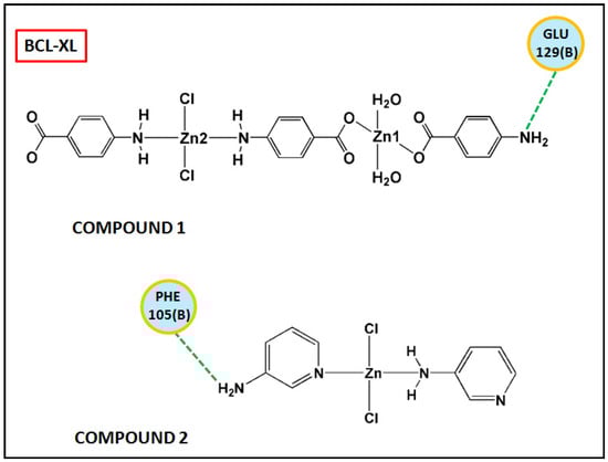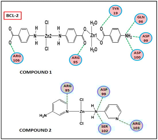 The presence of carboxyl, pyridine N-atom, amino groups, and aromatic rings in compounds 1 and 2 may facilitate hydrogen bond donors, acceptors, and hydrophobic regions during the compound’s interaction with target proteins. H-bond donors and acceptors are the key pharmacophore features in anticancer active molecules/complexes as they are effectively involved in H-bonding interactions with the active sites of antiapoptotic proteins; thereby inhibiting the activities of antiapoptotic proteins [72]. Hydrophobic regions present in a molecule can efficiently inhibit the polymerization and repair of DNA of cancerous cells [73]. Therefore, we have performed molecular docking studies of the compounds (vide infra) to investigate the possible interactions of the compounds with antiapoptotic target proteins.
