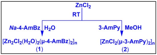 2.2.1. Synthesis of [Zn2Cl2(H2O)2(µ-4-AmBz)2]n (1)