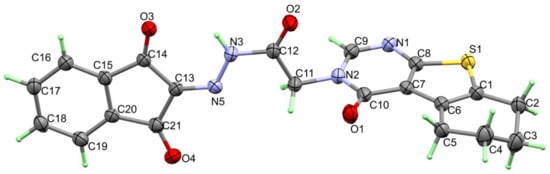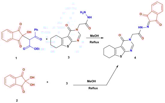 2.2. Synthesis of N′-(1,3-dioxo-1,3-dihydro-2H-inden-2-ylidene)-2-(4-oxo-5,6,7,8-tetrahydrobenzo[,]thieno[2,3-d]pyrimidin-3(4H)-yl)Acetohydrazide 4