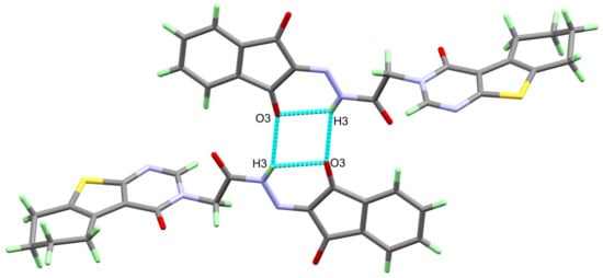 On the other hand, the analysis of the hydrogen bonding interactions in 4 revealed the presence of short intermolecular N(3)-H(3)...O(3) hydrogen bonds, which play an important role in the molecular packing of the studied system (Figure 2). The N(3)...O(3) donor–acceptor distance is 3.129 (3) Å, and the symmetry code of the hydrogen bond acceptor is – x + 1,−y,− z + 1 (Table 3).