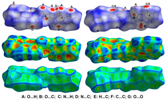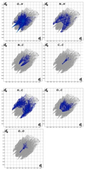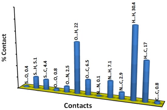 The decomposition of the different intermolecular contacts controlling the molecular packing of 4 was performed using Hirshfeld calculations. The decomposed fingerprint plots shown in Figure 3 gave a quantitative summary of each intermolecular contact occurring in the crystal. It is quite clear that there are large number of contacts which control the packing of the different molecular units in the crystal, where the H…H (30.4%), O…H (22.0%) and H…C (17.0%) contacts are the most dominant. In addition, there are some contributions from the N…H (7.1%), O…C (6.5%), S…H (5.1%) and S…C (4.4%) contacts (Figure 4). Not all contacts presented in Figure 2 have the characteristic feature of short interactions, where the O…H, N…H, H…C, N…C, O…C, C…C and O…O are the only contacts which appear as red spots in Figure 5. These short distance contacts and their corresponding distances are collected in Table 4. The majority of these short interactions have the characteristic sharp peaks in the fingerprint plot (Figure 3). Additionally, the results revealed the presence of significant amount of short N…C and C…C contacts which gave an indication on the presence of some π–π stacking interactions. The shape index and curvedness maps did not give any good indication about this type of interaction, probably due to the incomplete stacking of the aromatic π-system among the molecular units.