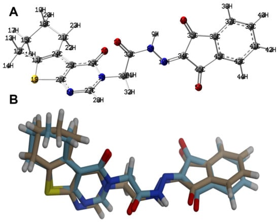 The calculated structure (A) and its overlay with the X-ray structure (B).