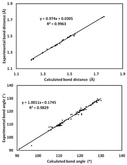 The optimized structure of 4 using B3LYP/6-31G(d,p) level of theory [,,] is shown in Figure 6 along with its overlay with the experimental one. The optimized structure gave no any imaginary frequencies indicating real energy minimum structure. There are some expected deviations in the calculated bond distances and angles (Figures S1 and S2, Table S1, Supplementary data). These deviations are generally attributed to the difference in the physical state between them, where the calculated structure is for a single molecule while the experimental structure is in the solid state. The former is free from the environment effects, while in the latter, the presence of intermolecular forces among molecular units has a great impact on the geometric parameters. Generally, there are good straight-line correlations, as shown in Figure 7, between the calculated and experimental geometric parameters (R2 = 0.9963–0.9829).