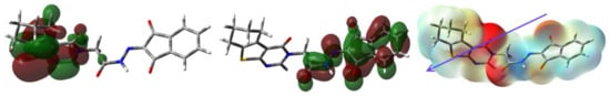 In MEP, the most electronegative red regions are close to the carbonyl carbon. In contrast, the blue electropositive regions are close to the hydrogen sites (Figure 9). In the same figure, the HOMO and LUMO presentations are also explored. It is clear that the HOMO and LUMO levels are mainly located over the π-system of the studied molecule. The one electron excitation from HOMO to LUMO could be described as an intramolecular charge transfer from the two fused aromatic rings in the tricyclic system to the ninhydrin moiety. The energy of this electronic transition is 2.5603 eV.
