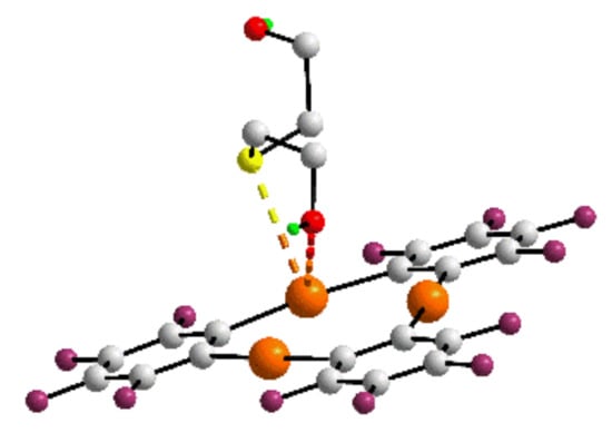 Supramolecular association in the crystal comprising tris(μ2-perfluoro-o-phenylene)-tri-mercury bis(2-hydroxyethyl)sulphide (1:1) whereby the constituent molecules are assembled into a zero-dimensional aggregate, connected by both Hg···S and Hg···O contacts shown as orange/yellow and orange/red dashed lines, respectively. The colour code for this and subsequent diagrams: orange—mercury; yellow—sulphur; plum—fluoride; red—oxygen; grey—carbon; green—hydrogen. Non-acidic hydrogen atoms are removed for clarity.