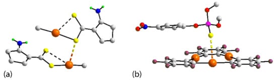 - Tsunoda, M.; Gabbai, F.P. Complexation of methylparathion and bis(2-hydroxyethyl)sulfide by the tridentate lewis acid [(o-C6F4Hg)3]. Heteroat. Chem. 2005, 16, 292–297. [Google Scholar] [CrossRef]