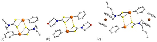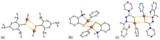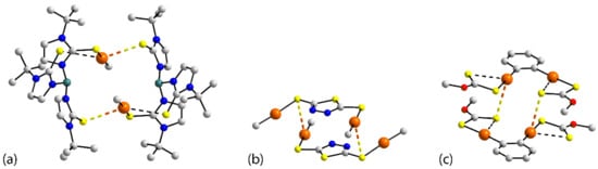 With a Hg⋯S separation of 3.349(12) Å right at the limit of the search criteria, the centrosymmetric aggregate in di-nuclear 33 assembles via a 12-membered {···HgSC3S}2 synthon, Figure 8b. The rather long Hg⋯S distance can be traced to a short intramolecular Hg⋯N contact of 2.93(3) Å as well as a second Hg⋯S contact of 3.429(13) Å involving the exocyclic mercury atom. Further inter-dimer Hg⋯N contacts [2.765(3) Å] assemble molecules into a three-dimensional array. A larger 14-membered {···HgC2HgSCS}2 synthon is noted in the dimeric aggregate of di-nuclear 34, Figure 8c, where mercury atoms occupy 1,2-positions of a phenyl ring. Intramolecular Hg⋯S [3.014(6) and 3.151(6) Å] interactions are also noted and further, longer Hg⋯S contacts [3.354(5) Å] link the dimers into a twisted supramolecular chain (see Supplementary Materials, Figures S1–S37).
