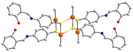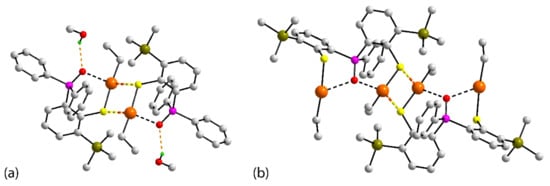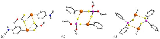 There are two examples of zero-dimensional aggregates sustained by a single Hg···S contact; the key geometric data for these zero-dimensional aggregates are included in Table 1. In the first of these, MeHg(2-aminocyclopent-1-ene-1-carbodithioato) (1), two molecules comprise the crystallographic asymmetric-unit and these assemble as shown in Figure 2a []. The structure is of dual interest in that (i) if a longer Hg···S contact is considered, that is, 3.362(2) Å, the two-molecule aggregates are assembled into a supramolecular chain with a twisted topology (see Supplementary Materials, Figures S1–S37), and (ii) 1 is a rare example herein of having a polymorphic relation, that is, 57, discussed below. The second example is noted in a 1:2 multi-component crystal related to that shown in Figure 1. In 2 [], one of the mercury atoms of the tri-mercury molecule accepts an Hg···S interaction from the P-bound thione-S atom of one of the two independent dimethyl(4-nitrophenyl)-thiophosphate co-formers, as illustrated in Figure 1b. Indeed, the sulphur straddles the three mercury atoms of the ring but the additional Hg···S separations are longer than the chosen van der Waals cut-off, that is, 3.399(3) and 3.428(3) Å. A similar situation pertains to the sulphur atom of the second conformer that sits atop the opposite face with Hg···S separations in the range 3.375(3) to 3.651(5) Å. The molecule in 2 represents the first of only three diorganomercury species discussed in this overview, the remaining examples comprise organomercury thiolate derivatives.