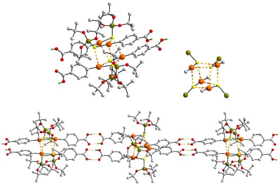Two independent molecules also comprise the asymmetric-unit of 4-HO2CC6H4Hg[SSi(OBu-t)3] (36). Each of these assemble about a site of to form a tetra-nuclear species. For each tetra-nuclear species, each mercury atom forms a single Hg⋯S within the sum of the van der Waals radii. However, for the first independent molecule, a second Hg⋯S contact [3.3737(15) Å], just beyond the sum of the van der Waals radii is apparent giving rise to the distorted cube motif illustrated in the two upper views of Figure 10. The benzoic acid substituents also participate in hydrogen bonding interactions leading to the supramolecular chain shown in the lower view of Figure 10 comprising alternating clusters of each independent molecule.