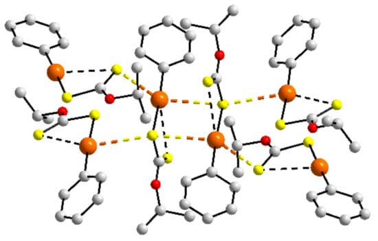 The last zero-dimensional aggregate to be described is observed in the crystal of PhHg(S2CO-i-Pr) (37), a hexa-nuclear species; Figure 11. The asymmetric-unit comprises three independent molecules. One of these self-associates about a centre of inversion to form a two-molecule aggregate resembling the supramolecular association noted for 18 and illustrated in Figure 4a. This aggregate exhibits the shorter of the three intermolecular Hg⋯S contacts [3.306(5) Å] and a short intramolecular Hg⋯S contact [3.159(5) Å]. The mercury and sulphur atoms participating in these Hg⋯S contacts each form an additional Hg⋯S interaction. Thus, each sulphur atom of the central dimer participates in a second Hg⋯S interaction [3.332(4) Å] from a pair of second independent molecules with the potential to form a second {⋯Hg–S}2 synthon; however, the second Hg⋯S separation well exceeds the sum of the van der Waals radii [3.457(3) Å]. At the same time, the mercury atom forms a pair of Hg⋯S contacts [3.3286(4) Å] with two of the third independent molecules. The result is a six-molecule aggregate. Intramolecular Hg⋯S interactions are also noted for the second and third independent molecules, being 3.309(4) and 3.211(4) Å, respectively.
