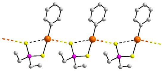 In this category, aggregation patterns are arranged in terms of the topology of the resulting one-dimensional chain and in order of the mercury atom content, that is, mono-, di- and tri-nuclear molecules; selected data are collated in Table 4. The first sub-category comprises linear arrays of molecules, 38–41. The first two one-dimensional aggregates are based on simple linear chains. In PhHg(S2PEt2) (38), Figure 12, and (Cl2C=CCl)Hg(S(C5H4N-2) (39), each mercury atom forms a single Hg···S contact. A notable feature of 39 is the formation of short Hg···N(pyridyl) contacts [2.808(19) Å]. Decidedly more complicated arrangements are noted in each of 40 and 41.