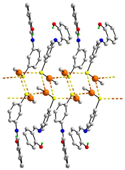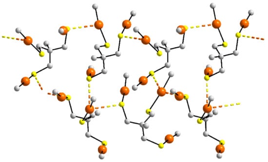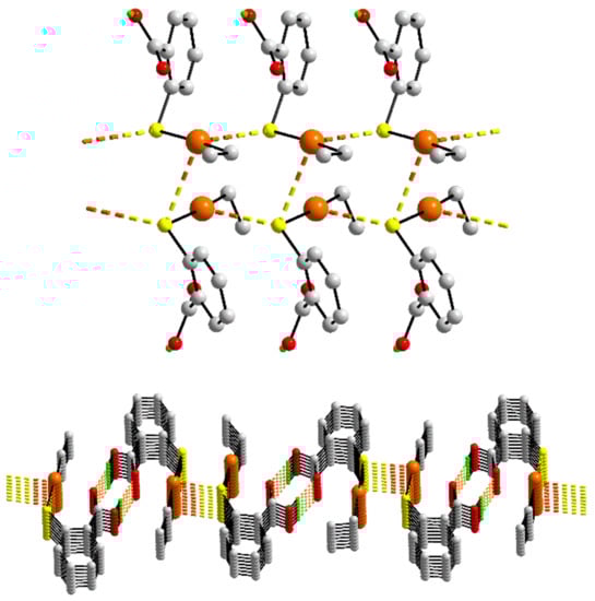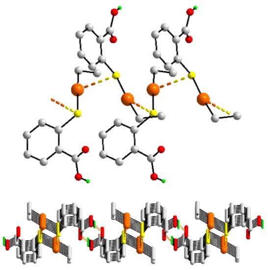 EtHg[SC6H4(CO2H)-2] (40) attracted interest in terms of the “Thimerosal controversy” concerning the relationship between the use of EtHg[SC6H4(CO2H)-2] as a preservative in vaccines which was said to be, but not substantiated, as the causative agent of autism in children []. In terms of the solid-state, four crystallographically independent molecules comprise the asymmetric-unit of 40. Each of these assembles into a linear, supramolecular via a single Hg···S interaction. As illustrated in the top view of Figure 13, two chains associate via an additional Hg···S interaction to form a supramolecular tape resembling a ladder. Data corresponding to one such assembly is presented in Table 4; the staves correspond to the third entry (for 40 in Table 4). For the second pair of linear chains, the Hg···S distance corresponding to the stave is slightly beyond the standard van der Waals separation; see Supplementary Materials, Figures S38–S59 for data. Intramolecular Hg···O(carbonyl) interactions are also observed with separations in the range 2.872(4) to 2.901(4) Å.
