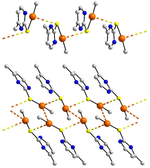 Molecules in 42–47 assemble into zigzag chains. The simplest example among the series, formulated as PhHg[SC(N=NC6H4OMe-2)NN(H)C6H4OMe-2] (42), has the zigzag chain propagated along a crystallographic glide axis. In each of 43, MeHg(Benzylidene-N,N-dimethylcarbamohydrazonothioato) and 44, MeHg(2-mercapto-4-methylpyrimidinato), similar symmetry prevails leading to the zigzag chain illustrated for 44 in the upper view of Figure 15. The crystal is particularly noteworthy for the presence of mercurophilic interactions []. As highlighted in the lower view of Figure 15, Hg···Hg contacts [3.805(3) Å] link the zigzag chains into double chains. Intramolecular Hg···N contacts are noted in each of 42 [2.725(3) Å], 43 [2.603(16) Å] and 44 [3.02(6) Å].