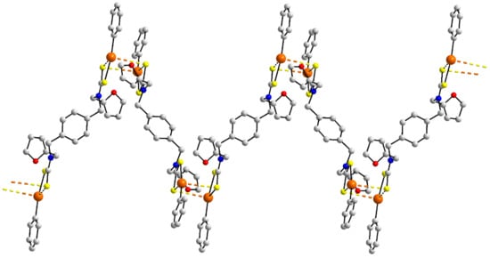 The di-nuclear molecule in phenylmercury derivative 47 features a bridging dithiocarbamate ligand formulated as {−S2CN(CH2-furanyl-2)[1,4-CH2C6H4CH2](2-furanyl-CH2)NCS2−}. Each end of the molecule associates about a 2-fold axis resembling the aggregate shown for 4 in Figure 3a. The di-nuclear molecules are assembled into a zigzag chain through the application of glide symmetry to give the assembly shown in Figure 17. The intramolecular Hg···S interaction is 2.933(8) Å.