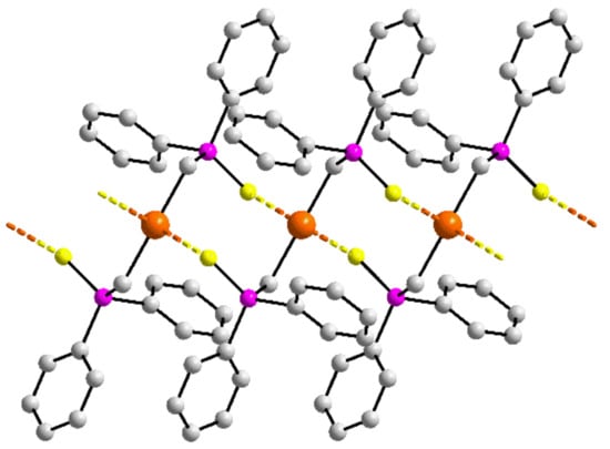 Supramolecular association in the crystal of 44: upper view—zigzag chain featuring Hg···S interactions; lower view—double chain formation through the agency of Hg···Hg interactions shown as orange dashed lines.