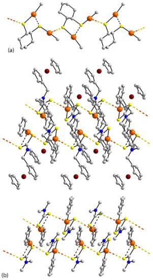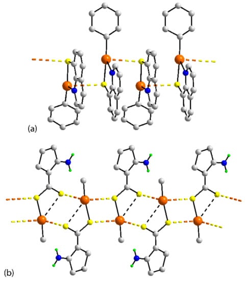 The next three examples in this sub-category relate to supramolecular association between di-nuclear species. The common feature of (MeHg)2(S2C6H10) (53), Figure 20a, and (PhHg)2(μ2-2,4-pyrimidinedithiolato) (54) is that only one of the two mercury atoms participate in Hg···S interactions within a helical chain. As evident from Figure 20a, intramolecular Hg···S interactions [2.853(16) Å] are present. In 54, intramolecular Hg···N contacts of 2.774(11) Å are noted.