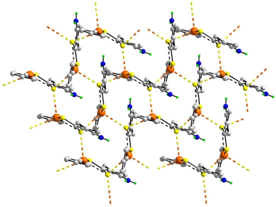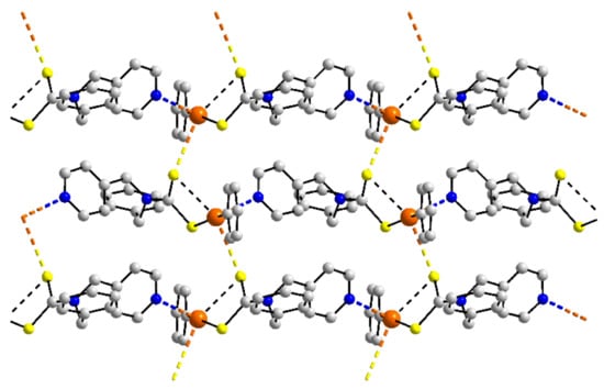 In 61, PhHg[S2CN(CH2Ph)CH2C5H4N-4], the dithiocarbamate ligand is functionalised with a 4-pyridyl residue; the structural chemistry of such dithiocarbamate ligands has recently been reviewed []. In the crystal, a linear chain is formed whereby in addition to the C–, S– donor set, the mercury atom is coordinated intermolecularly by the pyridyl-N atom [Hg···N = 2.74(2) Å]. The supramolecular chains are connected into a two-dimensional array via Hg···S contacts [Hg···S = 3.203(5) Å], as indicated in Figure 24. A side-on view of the supramolecular layer shows the benzyl substituents lie to either side; see Supplementary Materials Figures S61 and S62. In common with all other organomercury dithiocarbamates described herein, an intramolecular Hg···S contact is apparent [Hg···S = 2.993(5) Å].