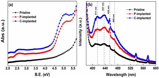 (a) Absorption spectrum and (b) PL spectrum of pristine, C-implanted, and P-implanted MgO samples.