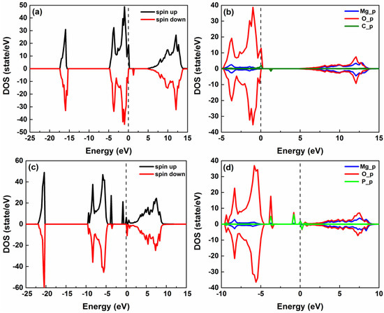 Total and partial spin-polarized DOS for the configuration of (a,c) VMg + CO in the C-implanted systems and (b,d) VMg + Pint in the P-implanted systems.