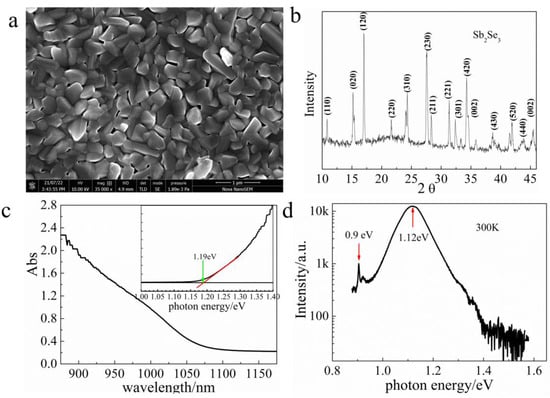 Figure 1. (a) Top-view SEM, (b) XRD, (c) optical absorbance and (d) photoluminescence of polycrystalline Sb2Se3 film. The inset of c is the direct band gap Tauc’s plot of Sb2Se3 film, and the red line is used for extrapolation.