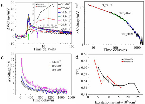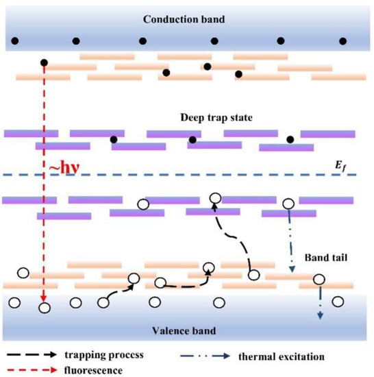Figure 2b presents a TRMC kinetic curve related with a trapped carrier thermal emission process in log–log coordinates, and the slope of the curve would equal ( 1 T T 0 ) if the TRMC kinetic can be well described by Equation (2). However, we found the extracted T T 0 value changes at different time scale, i.e., T T 0 is 0.78 in the range of 2–60 ns time delay, 0.68 in the range of 60–330 ns time delay and 0.24 in the range of 330–1800 ns time delay. With T equal to 300 K, the scale energy of the band tail state k B T 0 was calculated to range from 33.0 meV to about 110.0 meV. Experimental results show that a thermal emission carrier is not released from a sole exponential band tail. Multiple kinds of trap states are involved in the trapped carrier thermal emission process. Here, we use the calculated scale energy k B T 0 to estimate trap state depth. The thermal emission trapped carrier mainly originates from trap states, with depth ranging from 33.0 meV to 110.0 meV.