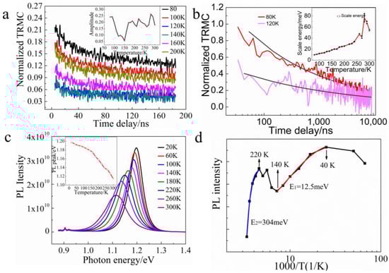 The dependence of main peak intensity on temperature is presented in Figure 3d. As temperature increases from 20 K to 40 K, the PL intensity increases. In the temperature range from 40 K to 140 K, the PL intensity reduces monotonously. While temperature exceeds 140 K, the PL intensity increases again until about 220 K, at which point the PL intensity start to reduce again. The negative thermal quenching of PL in Sb2Se3 (140–220 K) has also been reported in other semiconductors, such as ZnO and FASnI3 [26,27]. In Sb2Se3 film, thermal excitation of a trapped carrier into a continuous band and a shallow trap state is the main mechanism of negative thermal quenching of PL [28]. In polycrystalline Sb2Se3, the negative thermal quenching of PL and TRMC coincides in the same temperature range.