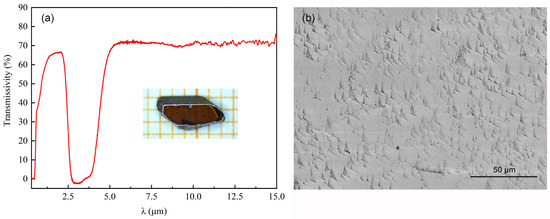 Figure 1 shows the transmittance spectrum of Fe2+:ZnSe single crystals grown via the traveling heater method. The average transmittance reached 70%, which is comparable to high-quality crystals [26]. The absorption cutoff edge was around 475 nm and its corresponding energy was higher than the bandgap energy of 2.54 eV for undoped ZnSe crystals at room temperature. The absorption cutoff edge shifted toward the shorter wavelength because of the electron transitions among the different energy states of the iron ions in the ZnSe crystals. A wide-band and strong absorption of around 3 μm was observed in the transmittance spectrum, which corresponded to the 5E(D) → 5T2(D) transition within the 3d6 shells of Fe2+ ions [27]. In addition, dislocation etch pits were observed on the ZnSe(110) cleavage plane, etched with 40% NaOH aqueous solution at 95 °C for 60 min; the etch pit density (EPD) was as high as 1.85 × 106 cm−2, as shown in Figure 1b.