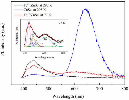 For Fe2+:ZnSe single crystals, seven emission bands (labeled T1–T7) were revealed by the Gaussian fitting, as shown in the inset in Figure 3. The T1 peak at 437 nm was assigned to the emission of excitons bound to neutral donors (, ) [35] to excitons bound to charge donors () [35] or neutral acceptors (, , ) [36,37]. The T2 peak at 466 nm could be attributed to the emission of donor-acceptor pairs (DAP), caused by a nitrogen-related acceptor [38] or associated with hydrogen-like impurities [20]. The T3 peak in the region of ~476 nm was allied to the emissions from dislocations in ZnSe crystals [20,39], often associated with grain boundaries in polycrystalline ZnSe [40]. Hence, for Fe2+:ZnSe single crystals with high dislocation density (1.85 × 106 cm−2), this T3 peak was more likely to be attributable to the emissions associated with a dislocation. The origins of these emission bands, T4–T7, have been studied extensively but remain unclear. The T4–T6 peaks at 512 nm, 572 nm and 608 nm could be attributed to the emissions of chlorine donor-vacancy recombination ( complex), or to the defect-complexes formed by intrinsic point defects (,) and Cu/oxygen/other background impurities [16,21,41]. Finally, the emission band, T7, with its maximum at 700 nm can be attributed to deep centers related to a background As impurity ( acceptor) [42].