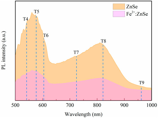The PL spectra of the iron-doped and undoped ZnSe single crystals were studied in the near-infrared spectrum region, as shown in Figure 4. Two new emission bands (T8–T9) with a maximum at 820 nm and 978 nm, respectively, were obtained via Gaussian fitting. The identification of these two peaks (T8 and T9) is still an open topic in the context of Fe2+:ZnSe crystals. The T9 peak at ~978 nm in the PL spectra of Fe2+: ZnSe crystals have been ascribed to the emission transition 3T1 → 5E of Fe2+ ions in Refs. [9,19]. In contrast, an electron-spin-resonance (ESR) study of iron-doped ZnSe crystals indicated that Fe3+ was responsible for an emission band with its maximum at 980 nm [34]. In addition, the luminescence and ESR studies for Fe:ZnS crystals showed that Fe3+ ions were considered as an emission center to account for the emission band at 980 nm [43]. However, this peak at ~978 nm was observed in both iron-doped and -undoped ZnSe single crystals, and its integrated intensity was greater in the iron-undoped sample compared with the iron-doped sample. Therefore, we believe that the luminescence peak at ~978 nm is not related to the emission band involving the doped iron atoms but may, instead, be associated with the emission band formed by the background Fe/another impurity-related defect complexes in ZnSe crystals. By the same token, we tentatively attribute the emission peak with a maximum at 820 nm to the emission band associated with background impurity-defect complexes, although it has previously been assigned to the emission transitions associated with Fe2+ levels [33].