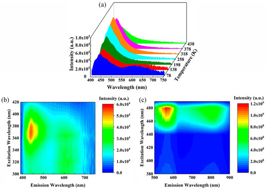 Figure 5 shows the dependence of the PL spectra of Fe2+:ZnSe single crystals on temperature and excitation wavelengths. With an increase in temperature, the PL intensity increased slightly and reached a maximum near room temperature for bound excitons (the blue bands, T1–T3 peaks), but the PL intensity decreased significantly for the impurity-defect emission bands (the green and red bands, T4–T7 peaks), as shown in Figure 5a. These results indicated that the thermal quenching effect of impurity-defect emission bands occurred in the temperature-dependent PL spectra. Various transition mechanisms leading to the thermal quenching of long-wavelength PL in iron-doped ZnSe/ZnS crystals were previously discussed in Refs. [34,44]. However, for bound excitons (the blue bands, T1–T3 peaks), the thermal quenching effect was not observed with an increase in temperatures, which might be due to the high quality (high purity and few native/impurity-related defects) of Fe2+:ZnSe single crystals, resulting in strongly bound exciton emissions [8,32]. In addition, it was found that their PL intensity first increased and then decreased with an increase in the excitation wavelength for the bound exciton emission bands (T1–T3 peaks); the maximum PL intensity of bound excitons was obtained at 364 nm, as shown in Figure 5b. For impurity-defect emission bands, their PL intensity increased with an increase in the excitation wavelengths, as shown in Figure 5c.