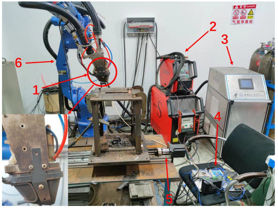 Welding system overall distribution physical diagram: 1—Plasma-MIG hybrid torch; 2—MIG power supply; 3—PAW power supply; 4—welding process control system; 5—walking mechanism; 6—welding robot.