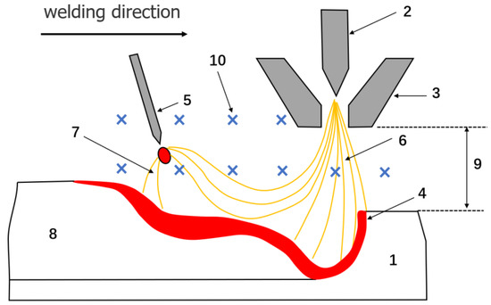 Plasma-MIG hybrid welding schematic diagram: 1—base metal, 2—tungsten electrode, 3—plasma nozzle, 4—molten metal, 5—welding wire, 6—plasma arc, 7—MIG arc, 8—weld, 9—the welding height (distance of plasma nozzle from workpiece), 10—magnetic field.