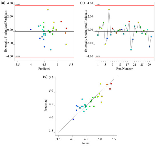 As shown in Figure 4a, the horizontal line in the middle is the residual zero line, and the distribution of the model’s prediction points on either side of it is random. As shown in Figure 4b, the horizontal line in the middle is the residual zero line, and the distribution of experimental points on either side of it is random, and there are no data points beyond the upper and lower red lines, so the residual error of the whole model is small. As shown in Figure 4c, the diagonal line is the fitting line, and data points obtained from the experiment are distributed in a relatively close distance on both sides of the fitting line.