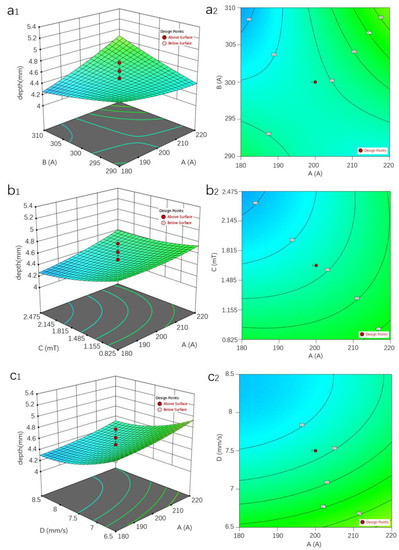 From Figure 6(c1,c2), it can be concluded that when the plasma current varies from 180 to 220 A, the welding speed varies from 6.5 to 8.5 mm/s, the MIG current is 300 A, and the magnetic flux density is 1.65 mT, the keyhole depth varied from 4.30 to 4.95 mm. The peak value of keyhole depth occurs at the plasma current maximum value and the welding speed minimum value within the selected range. In other words, within the selected parameters, the decrease in welding speed or the increase in plasma current is conducive to the increase in keyhole depth, because both changes are conducive to the increase in welding heat input. According to the contour diagram, the influence of welding velocity (0.5 mm/s) on keyhole depth is much greater than that of plasma current (10 A). There was no obvious interaction between factor A and factor D.