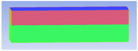 As shown in Figure 8, a model with a size of 40 × 8 × 11 mm is established, in which the length and width of the base material in the welding direction are 40 mm and 8 mm, and the thickness of the base material is 6 mm. The green grid part in Figure 8 is the model of 304 stainless steel base material. According to the actual welding height, an air layer with a thickness of 5 mm is established above the metal layer. The ICEM software was used to divide the mesh, and the mesh size was set to 0.4 mm. The top layer of the air layer (the blue side in the figure) is set as the velocity inlet, the pressure outlet is set around the air layer, and all the surfaces of the base metal are wall surfaces.