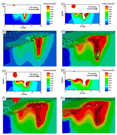 Temperature field distribution of the weld section and three-dimensional fluid flow diagram of the molten pool at different time: (a,c,e,g) are the temperature field of the weld section at 100 steps, 1000 steps, 1500 steps, and 2000 steps, respectively; (b,d,f,h) are the three-dimensional fluid flow diagrams of the molten pool at 100 steps, 1000 steps, 1500 steps, and 2000 steps, respectively.
