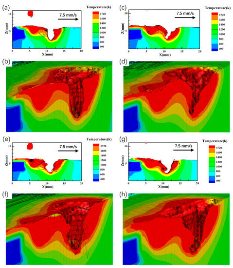 At the moment shown in Figure 10g,h, the two molten pools are completely fused into one molten pool, and the section of the front wall of the keyhole is still parabolic. However, due to the increase in molten metal in the common molten pool, the molten pool on the back wall of the keyhole moves down and the molten metal transition area at the bottom of the back wall of the keyhole becomes thicker when the air flow support force changes a little. The molten metal at the bottom of the keyhole can more quickly enter the common molten pool portion at the back end of the keyhole.